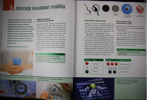 芬蘭課本中繼續介紹:「所有物質都由原子所構成。原子非常小,以至於它們不能被觀察。由於原子看不見,所以我們發展出多種的模型。原子模型有助於讓人們更容易地瞭解該物質的特性和它如何結合成其他結構。球狀模型是最簡單的原子模型,一個球代表一顆原子,這種模型並不介紹原子的結構。此模型通常像彩色的球一樣,雖然原子是無色,彩色的目的是為了區別不同的原子。原子的大小不同,所以在球狀模型中被描述為不同大小的球。因為氫原子最小所以用最小的球來描述。使用球狀模型,清楚標示球的顏色,以方便標示屬於什麼原子。」