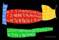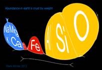 曾經在澳洲雪梨大學的化學系館佈告欄中,看到一張佈滿著16個週期表的海報(圖一),乍看之下就像是一隻隻變形蟲,吸引我駐足停留。在後來的教學中,我將之取名為「週期表十六變」。此16張週期表代表著元素的16種性質,包含原子半徑、共價半徑、固體密度、莫耳體積、宇宙大氣含量、地殼含量、導電性、導熱性、第一游離能、電負度、電子親和力、沸點、熔點、汽化熱、熔化熱、液態溫度範圍等。以代表地殼含量的性質為例,週期表圖片就像是一隻爬行於地面上的變形蝸牛,可以明顯看出除了氧、矽、鋁、鐵、鈣、鎂、鈉、鉀元素之外,其他元素幾乎弱化縮減成為一個點或連為一條線(圖二);若改以沸點高低的性質為例,則多數元素都佔有一定的勢力範圍,其中以金屬鎢和非金屬碳(鑽石)所佔據區域較大,而第18族的惰性氣體則弱化為形似變形蟲的尾巴或觸鬚。(圖三)