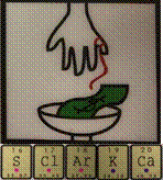中文字具有單音節的特性,用中文讀出週期表元素遠比用英文讀的音節數少得許多,也容易的多。由於歷年學測範圍多以原子序前20個元素為主,且社會組學生大多無法依照原子序1到20的順序,流利的說出20個元素。因此我在101學年度時以諧音法設計了週期表口訣,以5個元素為一組字詞,將4組字詞賦予新意,串成一個纏綿悱惻的故事,並由當時一位學生繪製成四張圖(圖四到圖七)。以原子序1到5為例,將「氫氦鋰鈹硼」轉換為「青海裡皮棚」,取其含意為「在青色的海裡,有一個獸皮縫製成的帳棚」。至於原子序6到20元素諧音部分,則建議老師能依此原則自行發揮創意與想像力,勾勒一個合乎邏輯的故事,故事情節可以盡量曲折離奇一點,介紹故事時也可以添油加醋,激發聽覺型學生的專注力;同時以PPT呈現色彩鮮明的口訣圖片,吸引視覺型學生的目光焦點;另外可搭配元素圖卡的抽取競賽或排序活動,使觸覺型學生可以在圖卡排列的操作過程中記下元素的原子序順序。