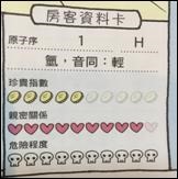 目前市面上有3~4本以漫畫風格介紹週期表化學元素的書籍,碰巧都是賦予每個元素一個人形外貌(圖廿七),個人認為能夠系統性且詳盡提供每個元素獨特資訊的入門書,還是非這本《原子有話要說~元素週期表【原子公寓圖解版】》莫屬。該書除了以原子序為門牌號碼,以鮮明的性格彰顯元素的特徵之外,還提供「房客資料卡」(圖廿八)——包含房客的珍貴指數(如︰購買價值)、親密關係(如︰與日常生活之關係、對社會的貢獻度、與人類的契合度等)、危險程度(如︰毒性、活性、放射性等)等三類資料,另外設有「冷知識」專欄—包含相關有用情報、特殊話題、讓人感動之事等,以及「科學數據」專欄—包含特性、發現年分、發現者、名稱由來、原子量、密度等。