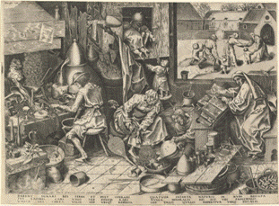圖四(右)、荷蘭畫家Pieter Bruegel the Elder (1525-1569) 所繪製的鍊金術士工作坊(The Alchemist)(Wikimedia公眾領域圖片)