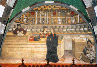 Apothecary這個字,源自於希臘文的apothēkē,原意是顧店的人,通常指的是藥房與藥房的主人。想要了解藥房的生意,首先需做市場調查。在臺灣與日本的城市裡,滿街可見便利商店,其密度是每兩千居民有一家。在十六世紀下半葉,克里蒙納的居民是四萬,卻有三十七家藥房(義大利文speziali),比便利商店的密度還高,可見生意很好。藥房的老闆,主要是具備化學知識的藥劑師。Apothecary賣的不只是藥物,還有化妝品、香料、油漆、顏料、糖果等等加工製品。於是醫師在裡面給人看病當場抓藥,理髮師也在裡面攬客理髮做美容,畫家要選顏料,工人要找油漆,小孩要買糖果,全都聚在店裡,連街頭巷尾的八卦議論也少不了,自然是生意興隆。這樣的商業模式不只有零售(見圖三),還兼批發與製造,有自己的倉庫與工作坊(見圖四)。