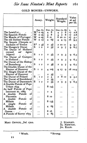 圖一、牛頓對於各國金幣所提出的檢驗報告 (Newton, 1896)(由Google Books數位化)