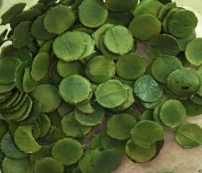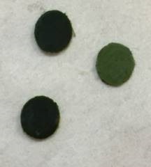 用酒精萃取葉綠素前葉錠的顏色比較綠,萃取葉綠素後葉錠的顏色比較淺。桑葉的葉錠幾乎呈現半透明的狀態,摸起來軟軟的,等酒精蒸發完後,葉錠會呈現捲曲狀、脆脆的,好像茶葉一樣;福木的葉錠中間綠色幾乎沒變,而周圍有點白色的,摸起來比較還是硬的,但是有比萃取前的葉錠軟一些,等酒精蒸發完後,葉錠形狀沒變,只是比較脆。用水萃取完後的葉錠,摸起硬硬的,跟萃取前沒有太大的差別 |