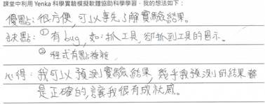 在回饋問卷中,亦進一步瞭解實驗組學生在課堂中利用Yenkadk 科學實驗模擬軟體協助學習的看法,知道學生同意藉此學習方式能預測實驗結果並熟練實驗步驟,可增加學習成就感與提高真實實驗結果的準確性,茲將部份學生回饋單內容呈現,如圖6-1~6-2所示: