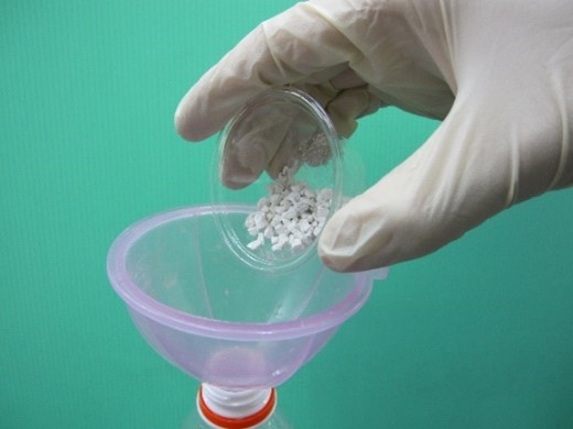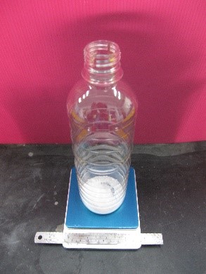 當進行反應[3]時,加入1茶匙(5.3 g)的氧化鈣,相當於94 mmol(5.3 g / 56.1 g‧mol-1)的氧化鈣。加水後產生94 mmol的氫氧化鈣,可消耗二氧化碳的莫耳數為94 mmol,亦即可消耗二氧化碳體積2300 mL (94 mmol × 24.45 L‧mol-1)。這氧化鈣的使用量足以消耗5.1個充滿二氧化碳的寶特瓶(瓶容量450 mL)。