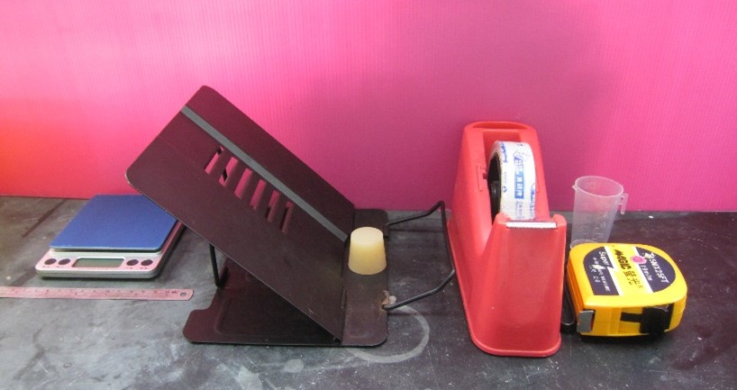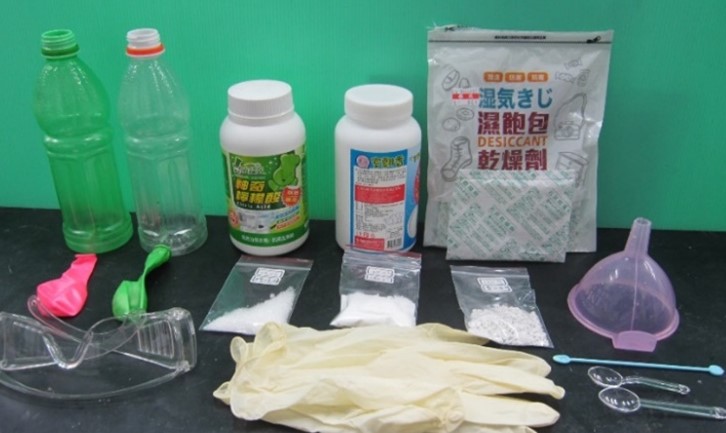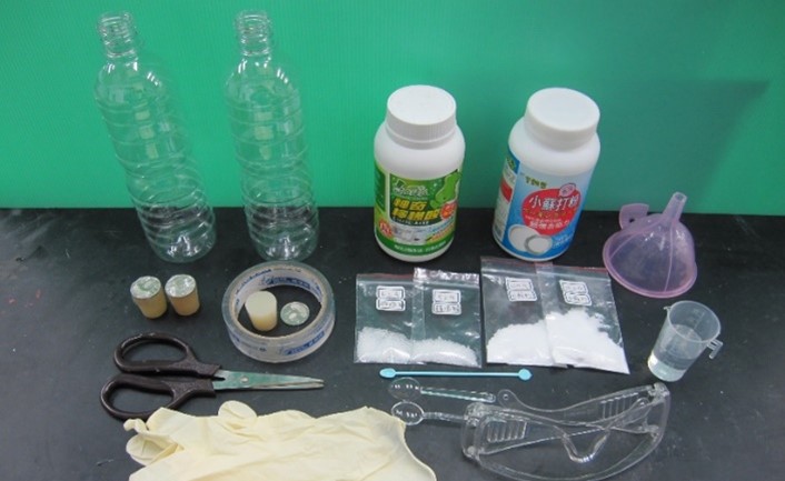 為使競賽趨於公平,避免不必要的紛爭,【項目二】:〈二氧化碳與壓力〉使用的藥品和器材由大會統一提供,而且限制其規格和數量。這方面分為兩類:(1)大會提供各隊的藥品與器材,如表1和圖2所示;和(2)大會提供公共的藥品與器材,如表2和圖3所示。另外,安全用具由參賽學生自備,如表3和圖2下方所示,規定自備的原因是學生平時在校操作化學實驗應該遵守實驗室安全守則,安全用具是必備用品。辦理單位應該事先準備一些安全用具,以備學生忘記攜帶的不時之需。