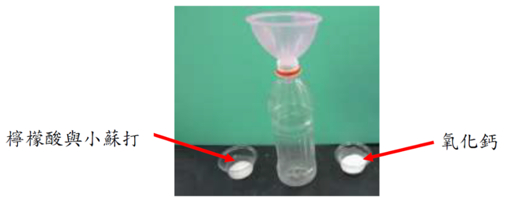 在項目二:〈二氧化碳與壓力〉的兩活動,涉及的第一反應為碳酸氫鈉(NaHCO3)與檸檬酸(C6H8O7)的反應,當兩反應物混合後,加入水會立即發生化學反應,產生二氧化碳(CO2)氣體和檸檬酸三鈉(Na3C6H7O7),其反應如式[1]所示:
