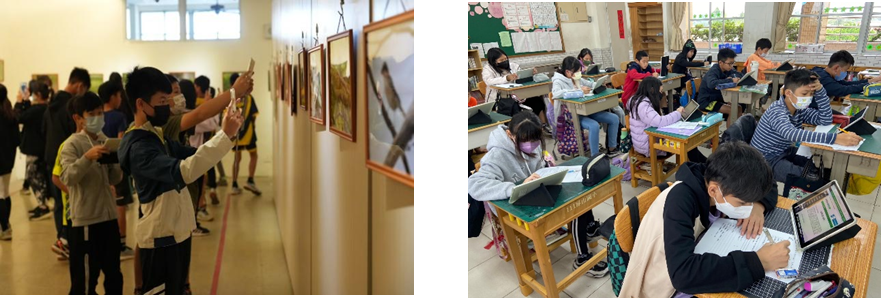 3.教學場域轉移至校內兒童美術館,學生翻拍攝影作品並練習使用AI進行查詢。